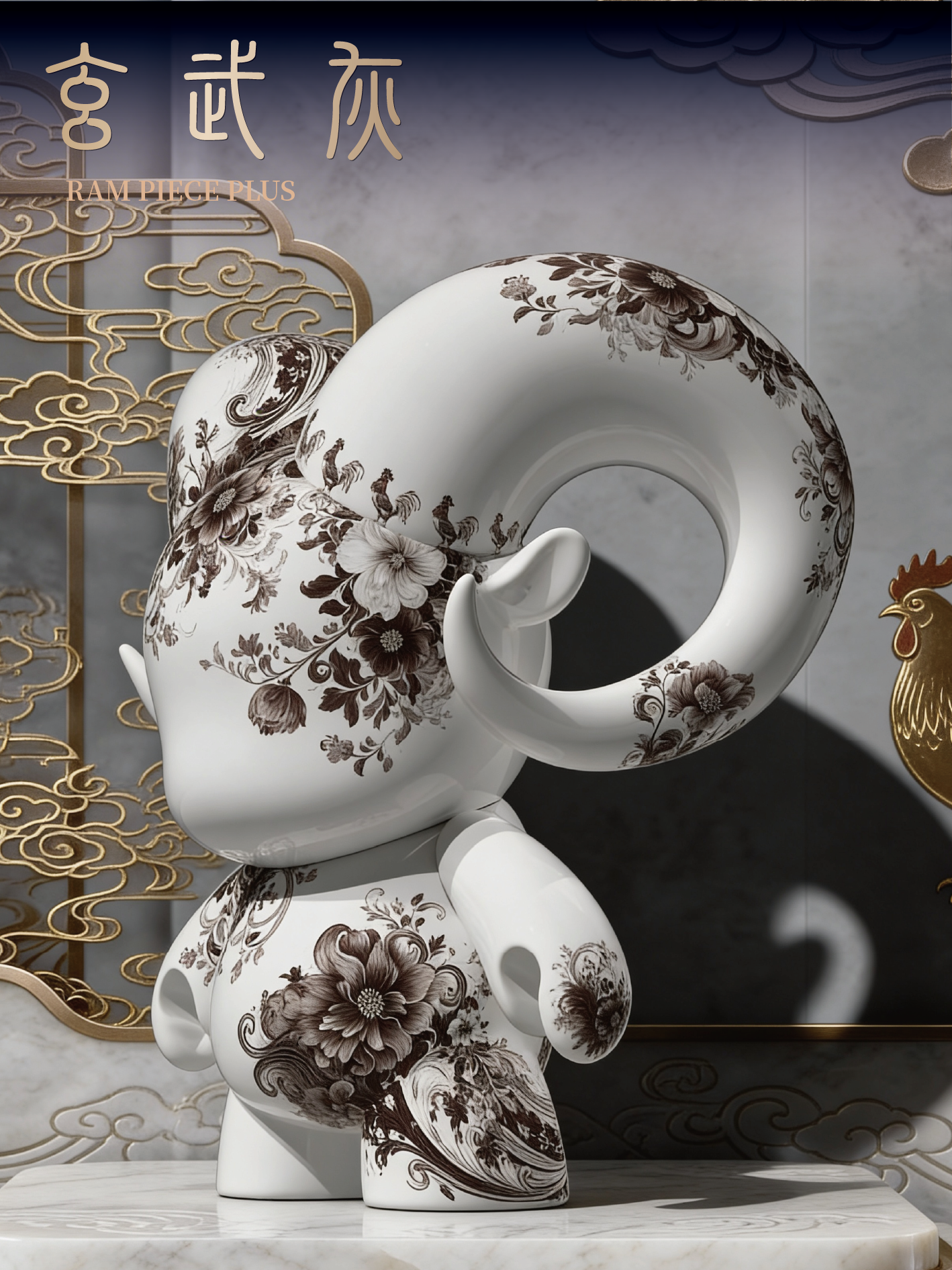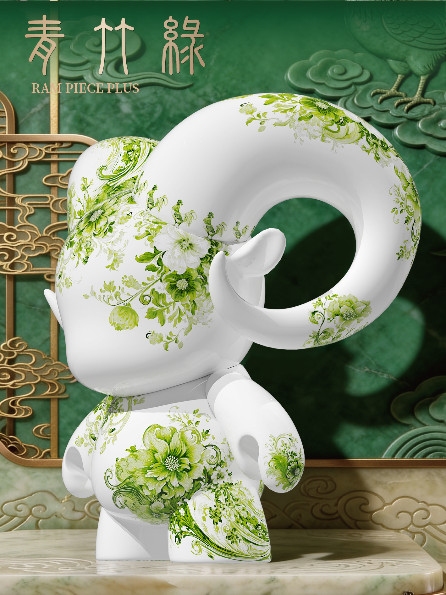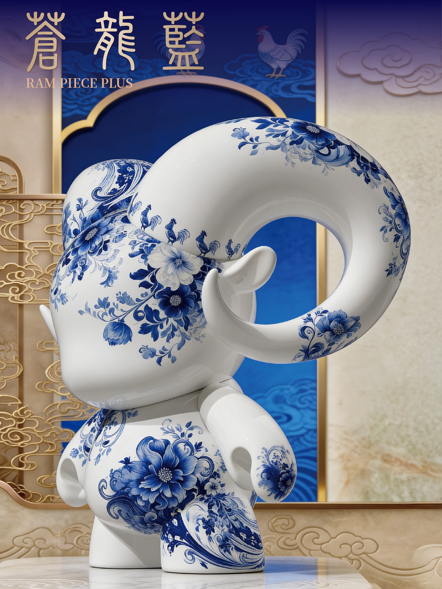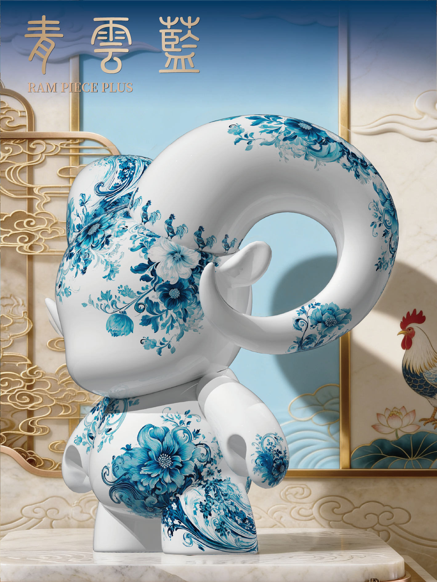八靈靜立於青花紋脈之間,羽姿整肅,步履有節。